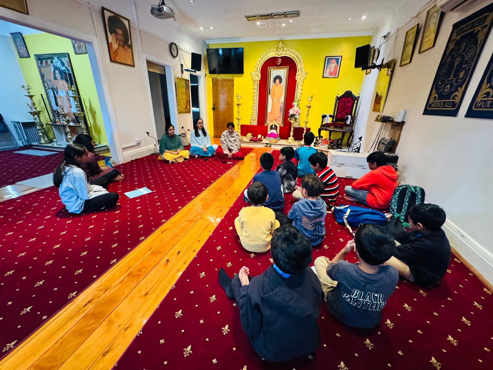The Young Adults lovingly introduced the SSE children to the harmonium, tabla, manjira, and kanjira—helping them explore the beauty of bhajans in a hands-on, joyful way.