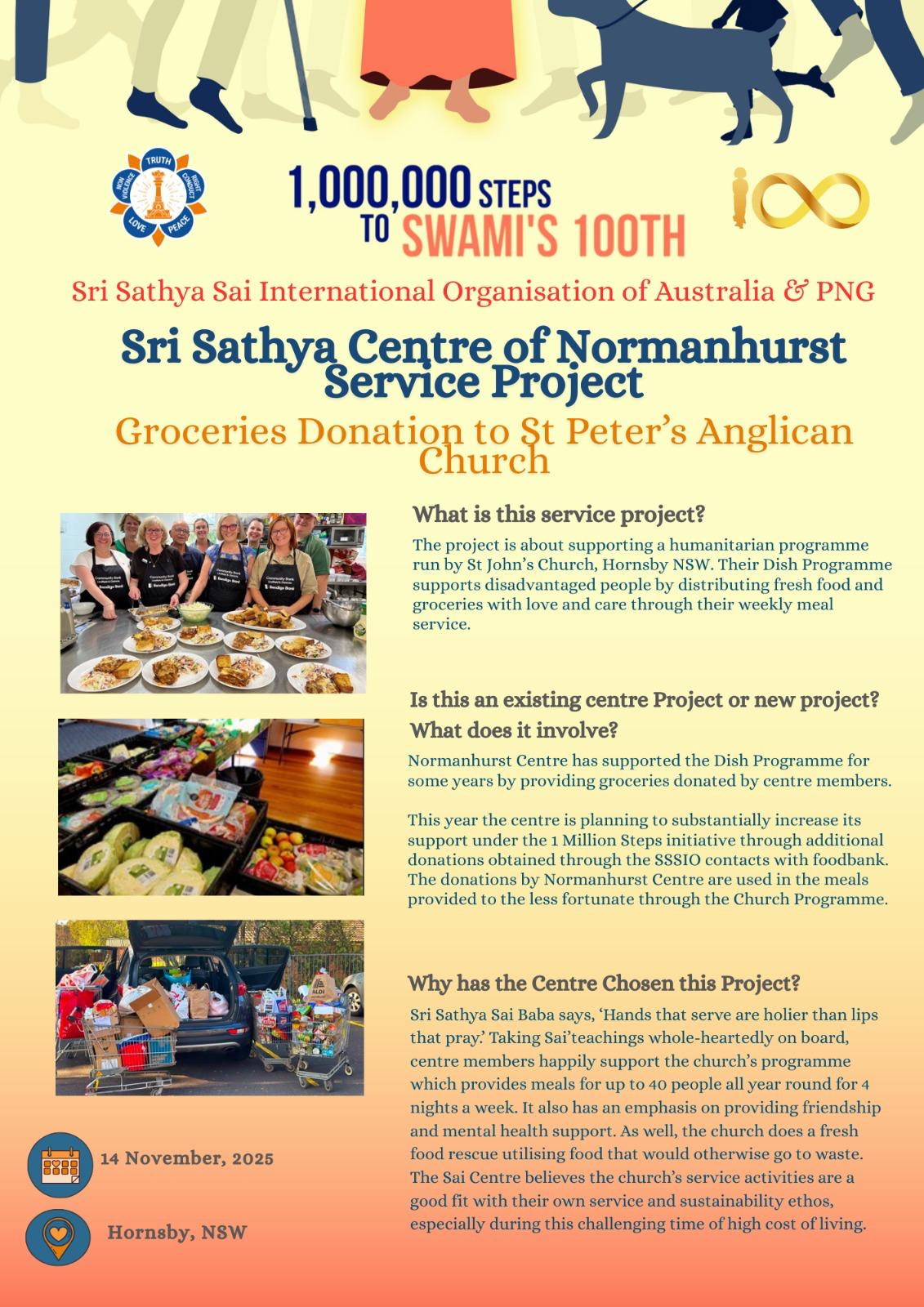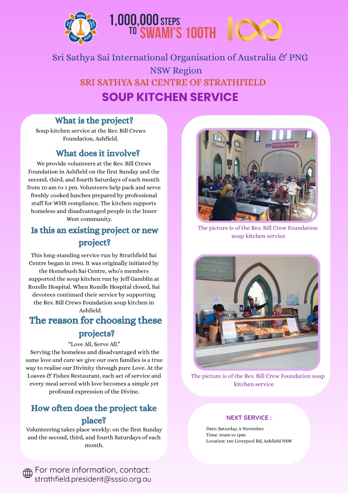 NSW Region: Feeding the homelessMay 12, 2025Commencing in August 2024, NSW Region of the Sri Sathya Sai International Organisation of Australia & PNG commenced a monthly program of feeding and providing other necessities to the homeless in the Sydney CDB area. [more]