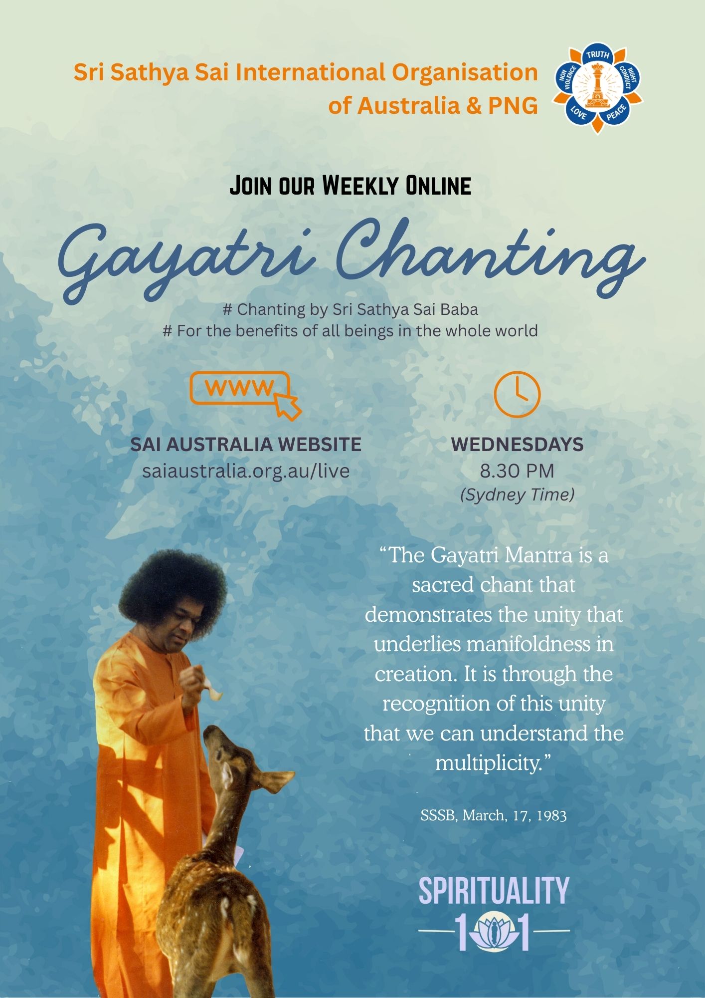 Victoria – Sathya Sai Baba’s 100th Year Anni…January 21, 2026!! NEW !! Victoria Region of the SSSIO celebrated the 100th anniversary of the advent of Sathya Sai Baba by holding a two-day spiritual retreat. A truly uplifting and inspiring event. Sathya Sai Baba was born on earth to re-establish righteousness, for the protection of all beings and to guide people to recognise their inherent divinity through love, selfless service and spiritual transformation. [more]